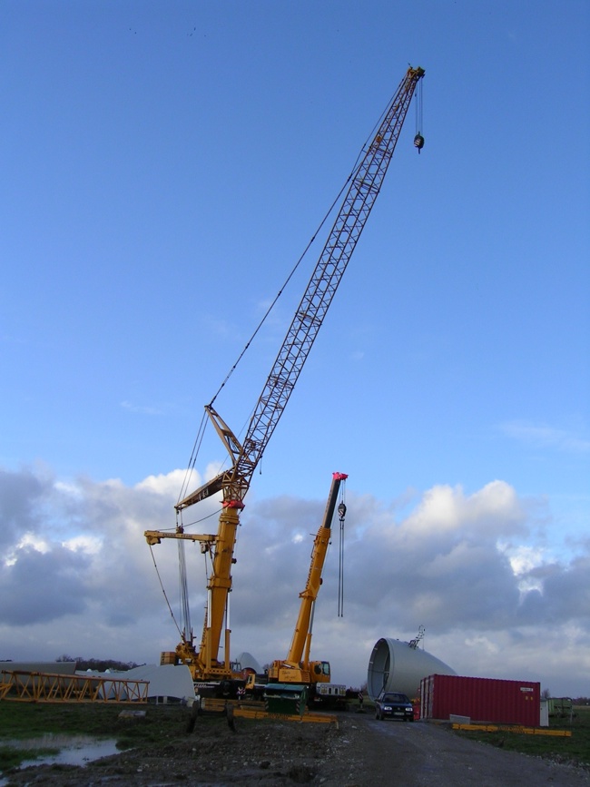 hallo zusammen, war heut mal wieder an der baustelle. die erste anlage steht, bis auf den rotor. der liegt komplett montiert neben der anglage. der LTM1500-8.1 ist demontiert worden und steht jetzt neben der zweiten anlage. der turm ist heut angeliefert worden, wieder von buller. das maschinenhaus und die narbe liegt schon seit dem wochenende rum. weiss jemand wieso der rotor nicht montiert wird??? wird da ein anderer kran für benötigt, bei den anlagen handelt es sich um die e-70 von enercon |